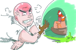 蛋没有捡到,鸡屎摸了一手,大佬十分气愤,准备回家取火把鸡窝烧掉。不料,没跑几步,就被石头绊了脚,摔得仰面朝天。用手一抹,身上脸上全是鸡屎,活脱脱的一个“鸡屎客”。