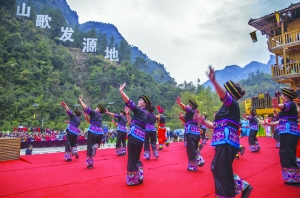 近日,龙山县舞蹈演员在重庆市黔江区小南海镇十三寨表演土家摆手舞。为了促进周边地区群众感情和文化交流,该地举行湘鄂渝边区民间舞蹈大赛,龙山县组织了20多支代表队400多名舞蹈演员参加,独具特色土家族舞蹈征服了评委和观众。 田良东 摄