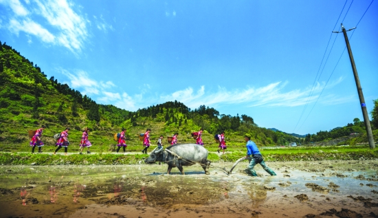 春耕时节,乡间处处春耕忙碌景象。4月14日,永顺县西歧乡西龙村向家寨一农民赶着水牛耕田。几位身着民族服装的姑娘洗衣归来从田硬走过,蓝天白云下,美丽乡村的田野上景色靓丽迷人。 余光龙 摄