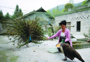 4月17日,保靖县清水坪镇杰坳村村民杨秀芝在忙着喂孔雀。近年来,该县充分利用山区资源,因地制宜引导农户养殖蛋鸡、竹鼠、湘西黄牛等,大力发展特色养殖,并注重发挥养殖能手和合作社的辐射带动作用,成为当地农民脱贫致富的新亮点。