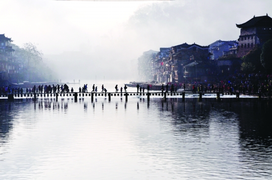 近日,浓雾笼罩下的凤凰古城核心景区游客在赏景游玩。久雨初晴,凤凰古城的沱江水岸层层浓雾缭绕,绮丽神美,景色迷人,人舟如在画中游。 滕建康 摄