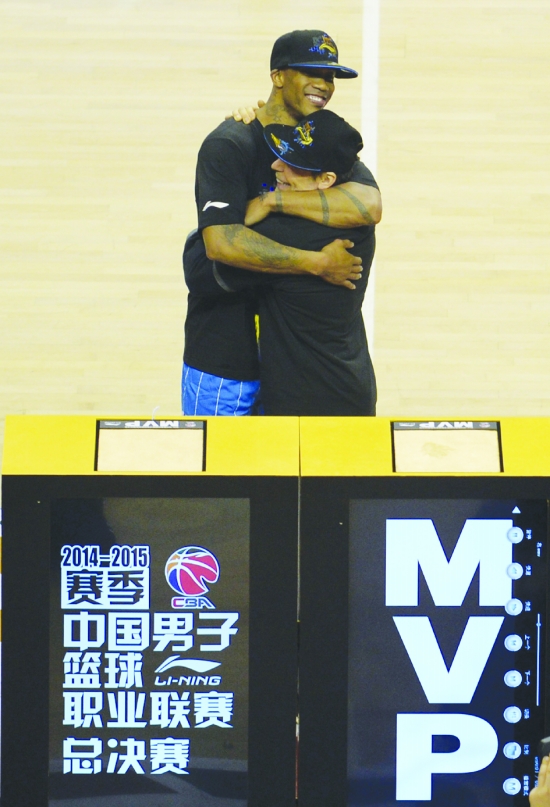 图为2015年3月22日,马布里(左)在总决赛MVP颁奖仪式上与队友拥抱庆祝。 新华社记者 潘昱龙 摄