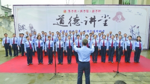 4月27日,在和谐酒业营销有限公司,州工商局干部职工正在合唱《公民道德歌》。当天该局与和谐酒业营销有限公司举办以“诚实守信”为主题的“道德讲堂”活动。