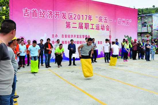 4月28日,由吉首经开区主办的“庆五一 迎州庆”第二届职工运动会在吉首经开区创新创业园内精彩上演。来自吉首经开区机关以及园区企业、园区建设施工单位的18支代表队参与了五项集体比赛项目。 周名猛 杨 卿 摄