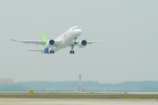 5月5日,中国首款国际主流水准的干线客机C919在上海浦东国际机场首飞。新华社记者 丁 汀 摄