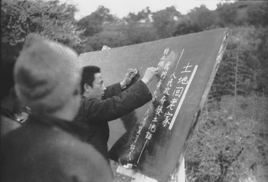用黑板报宣传土改胜利。