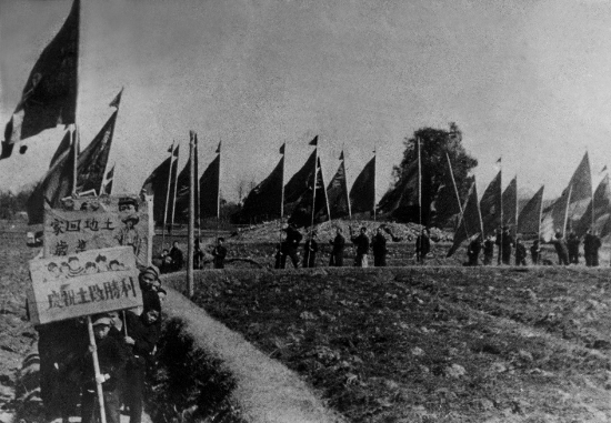 吉首县万溶江乡的农民欢庆土改胜利在田地间游行。