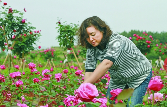 麻玉芹在给观赏玫瑰剪枝。 龙群峰 摄