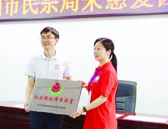 5月20日,苏州市民宗局、苏州民族团结进步促进会带领多家爱心企业负责人来我州慈爱园考察调研,并为慈爱园捐赠30台学习电脑,为慈爱园的孩子们上网学习提供便利。图为爱心人士代表向慈爱园园长张薇捐赠电脑。 易 瑜 摄