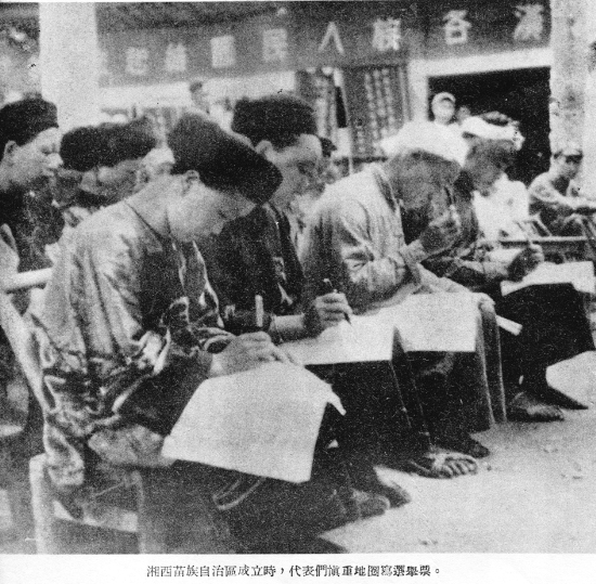 湘西苗族自治区第一次代表大会上,代表们在认真填写选票。