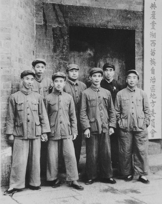 当选的湘西苗族自治区主要负责人(从左至右:杨明显、张宏光、朱干、程焕星、石邦智、赵德新、陈郁发)。