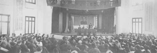 1955年湘西苗族自治区更名为湘西苗族自治州。该图为湘西苗族自治州一届三次大会举行的全体代表会议会场。