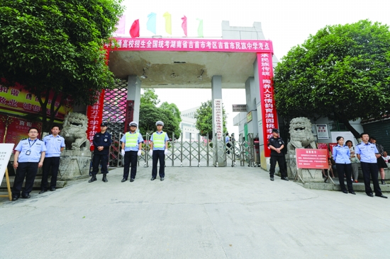 6月8日,高考第二天,在吉首市考区市民族中学考点,该市公安、交警等部门联合全力护航高考,确保考试期间不发生意外事件。 汪 洋 摄