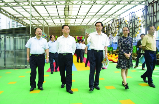 省人大常委会副主任李友志(中)一行在州委书记叶红专(左二)陪同下到葵花朵朵幼儿园察看该校贯彻落实《防震减灾法》有关工作情况。 本报记者 刘炜 摄