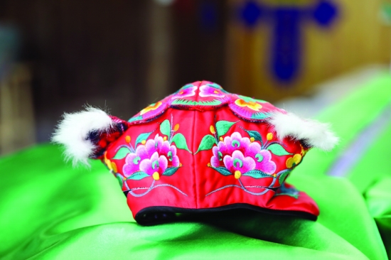 麻妹英与留守妇女们研发的苗绣婴儿帽(冬帽)。