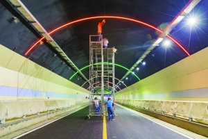 6月5日,湘西经开区马鞍山隧道内,工人正在进行最后一次线路调试相关工作。该隧道是连接该区东区和西区产业园的首条隧道交通,长950米,宽13.5米,高9.7米,将于6月底全面竣工通车。