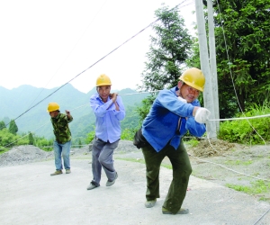 6月11日,国网保靖供电公司电力技术人员在毛沟镇民主村易地扶贫搬迁小区,为易地搬迁户架设供电线路、安装用电设备。 近年来,为确保易地搬迁的群众用上放心电,该公司开辟易地扶贫搬迁用电服务绿色通道,坚持搬迁移民房建到哪里,供电线路就架设到哪里,倾力服务全县各个乡镇的易地扶贫搬迁工程。 俞采华 曹 彪 摄