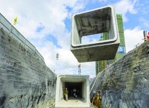 6月9日,湘西经开区长潭路,施工工人正在进行地下综合管廊预制混凝土箱涵安装作业。今年该区在长潭路、丰达路实施地下综合管廊工程建设,全长2000余米,计划7月底前完成,加快打通城市地下“动脉”。 本报特约记者 刘振军 通讯员 张术杰 摄