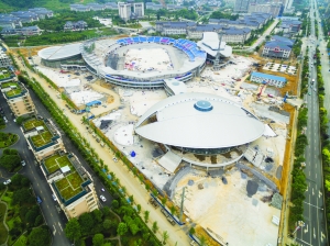 6月18日,湘西州文化体育会展中心项目施工工地,工人们正在加快外饰装修等工程进度。该项目占地面积163亩,总建筑面积约5万平方米,计划9月20日前全面竣工投入使用,目前该项目主要场馆设施主体工程已全部完工。 本报特约记者 刘振军 通讯员 张术杰 摄