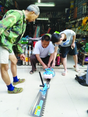 6月21日,吉首市武陵西路机电街,来自保靖县吕洞山镇的茶农正在购买新型农机———绿篱机,以便抢抓季节为自家开发的茶叶修枝剪叶。 本报记者 杨继东 摄