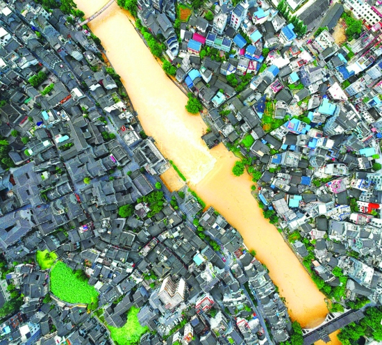 记者从州防汛指挥部了解到,6月22日8时至23日8时,吉首地区最大降雨达184.1毫米,各河流水位均有大幅上涨。图为23日下午2点万溶江洪峰过境航拍图。 本报记者 刘 炜 通讯员 王泽健 摄