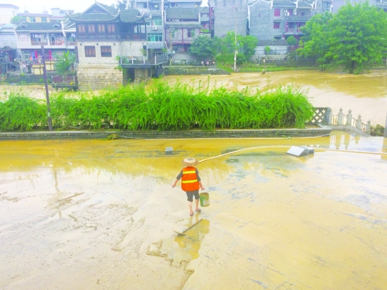 6月23日中午,洪峰稍作消退后,乾州古城景区环卫工人正在三门开旁广场进行清淤作业。 本报记者 刘 炜 摄
