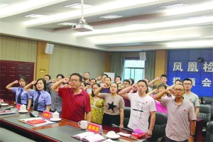 6月30日,凤凰县检察院全院党员在党旗下再次庄严宣誓,重温入党誓词。