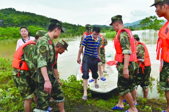 7月2日,在广西全州县黄沙河镇水车村,武警官兵和当地干部乘船巡查群众受困地点归来。 近日,受持续强降雨天气影响,广西全州县湘江、灌江、万乡河汇水后水位持续上涨,沿岸及下游村庄严重受灾。 新华社发李绚丽 摄