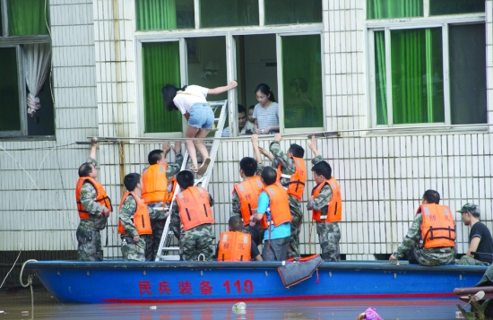 7月2日,民兵应急分队在湖南省新邵县酿溪镇解救被困群众。 连日来,持续性降雨使湖南省邵阳市新邵县遭遇了今年入汛以来的最大洪水,当地已组织各方力量抗洪抢险。 新华社发 吕建设 摄