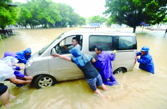 7月2日,在广西柳州市街头,市民转移一辆被洪水浸泡的汽车。 近日,受强降雨影响,广西柳州市部分地段积水严重。 新华社发 黎寒池 摄