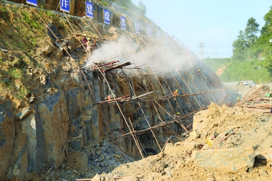 边坡锚杆风动钻机钻孔。