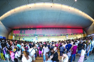 7月6日,滞留旅客在武汉火车站售票厅外排队等待退换票。