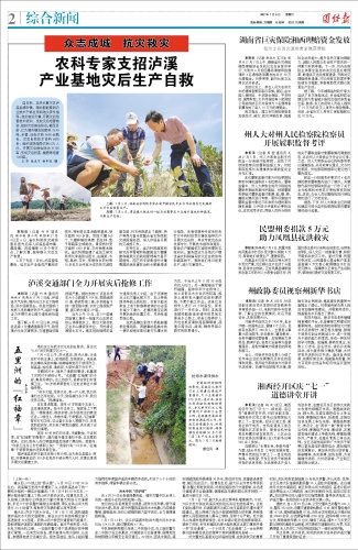 连日来,在洪水重灾区泸溪县浦市镇,随处都能看到农业技术干部在田间地头奔忙指导。他们核实灾情,开展灾后培管技术培训,发放灾后培管物资,组织灾后病虫防治。截至目前,已为浦市镇发放肥料25.95吨,杀菌、治虫农药5800余瓶包,灾后自救技术资料6800份;组织现场指导农民620人次,开展灾后病虫防治31700亩,完成灾后扶苗、施肥等培管1200亩。 王 芳 张克宁 谢申旺 摄 本报讯(记者 付 丹 通讯员 周书栋 龚小凤 熊绍军)7月4日至6日,省农科院抗灾减损服务团先后深入泸溪县浦市镇、潭溪镇、洗溪镇等10多个受灾点,了解灾情,指导群众灾后生产恢复。 6月下旬至7月初,泸溪普降暴雨,给农业产业造成严重经济损失,特别是五里洲蔬菜基地,受灾面积900多亩,受损大棚560个,大棚种植的辣椒、西红柿、茄子等蔬菜全部绝收。黄家桥村受灾面积1000多亩,农村物基本绝收。省农科院组建了省加工研究所所长李高阳任团长,由蔬菜、水稻、果树、茶叶、旱粮和中药材等10多名农业专家为成员的灾减损服务团,州农科院派出了蔬菜、特产种养方面专家配合省农科院救灾减损服务团,深入泸溪县开展抗灾减损工作。 在受灾点,省农科院蔬菜所研究员李雪峰和杨建国在大棚重建和蔬菜灾后栽培管理等方面开展指导,园艺所专家黄佳针对葡萄园的病虫害防治和水肥管理进行指导,生物资源所专家朱校奇针对中药材的受灾情况指导农户开展灾后自救,其余专家也各自发挥专长,开展技术指导和服务,帮助农户掌握抗灾减损所需的农技知识。服务团还为当地农户赠送省农科院编写的灾后自救资料和蔬菜种子,帮助他们早日恢复生产,减少灾害损失。 |