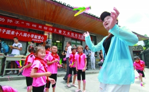 7月14日,花垣县双龙镇十八洞村,广州新世纪国际旅行社亲子团的阿姨和村里的孩子们一起踢毽子。当天,广州新世纪国际旅行社亲子团来到十八洞村,给孩子们送来了图书和文具,还和孩子们一起做游戏,温暖孩子们的心。 龙恩泽 摄