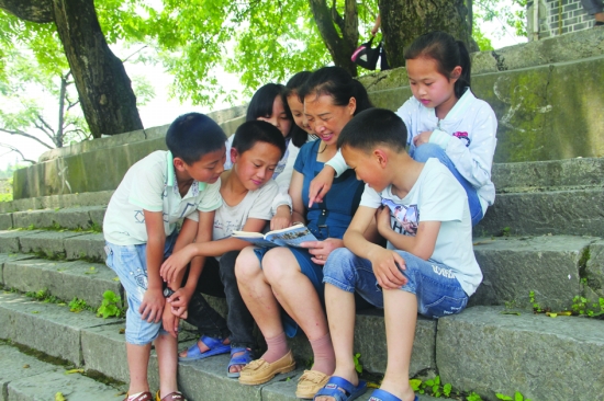 核桃树下,麻桂珍与孩子们共同探讨苗文知识。