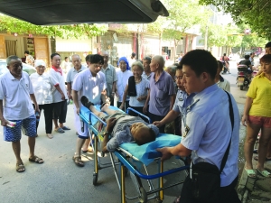 7月16日,一名老人突然晕倒在泸溪县武溪镇街头。该县城管队员见状后立即拨打了120急救电话,并对老人紧急施救。待急救医护人员抵达现场,执法队员配合医护人员把老人抬到救护车上送往县医院救治。城管提示:时下正值高温酷暑,中午室外温度过高,应尽量避免老人单独外出。 谭林波 王 芳 摄