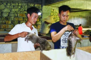 7月18日,龙山县靛房镇联星社区,技术人员在查看竹鼠生长情况。该社区利用本地丰富的资源优势,大力发展特色养殖业,养殖野猪、竹鼠等,目前有养殖大户14家, 特色养殖产业的发展有力促进了当地群众脱贫致富。