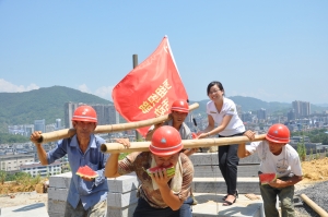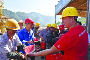 ▲ 7月26日,永顺县总工会与溪州新城建设指挥部的工作人员走进溪州新城建设工地,给奋战在烈日下的一线工人送去了防暑药品、矿泉水和西瓜等慰问物品。 刘仕基 摄