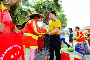 ▲ 7月28日,吉首市委组织部开展“夏日送清凉”活动,给为迎接州庆抢抓工期的施工人员送去冰西瓜、冰红茶等消暑物品,总价值近5000元。图为在文峰公园工地现场,工作人员给施工人员送上冰西瓜。 金 城 姚丁伟 摄