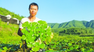 7月23日,在泸溪县浦市镇高山坪村,村民唐正赢脸带微笑地向笔者展示自己引种的菱角。今年,他在村中流转了20多亩水田种植菱角。经过精心培管,长势喜人,丰收在望。唐正赢去年试种了3亩多菱角并获成功,今年便扩大了种植面积,计划进入采摘期后,新鲜菱角销售和菱种供销同步进行。同时,争取带动更多贫困群众发展菱角种植,从中受益。