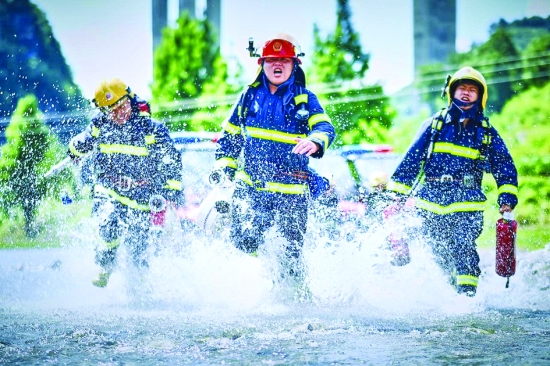 近日,为进一步提升夏季防火、灭火和应急救援能力,凤凰县消防大队通过开展消防演练,向市民和游客宣传防火灭火知识和技能,加强景区消防巡逻等措施,全力保障凤凰古城消防安全。图为7月27日下午,消防官兵进行灭火救援联合演练。 本报记者 李再兴 通讯员 秦 帆 摄
