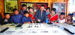 8月6日,吉首市石家冲街道寨阳村,杨再喜(中)在指导留守儿童练习书法。中国民族艺术家协会会员、湖南省书法家协会会员、吉首市石家冲街道寨阳村民杨再喜利用自家庭院办起农民书法园,开办留守儿童书法培训班,吸引了附近村寨20多名留守儿童练书法,让孩子们在学习书法知识的同时,快乐度暑假。 姚 方 摄
