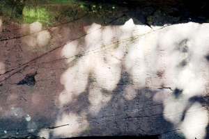按:该摩崖石刻位于吉首市太平乡司马村4组司马河畔耀齐田边,明嘉靖二十年(1541)张宸题刻。摩崖石为红砂岩,顶部与左边经人工打凿,形成一个两米见方的石宇,使摩崖面免于日晒雨淋。摩崖面经凿平修整打磨,整修面87×180厘米,刻面82×84厘米,10行,每行4字至14字不等,字径5厘米,楷书阴刻。崖石保存完整,但崖面多处裂缝、揭块剥落,文字漫漶。