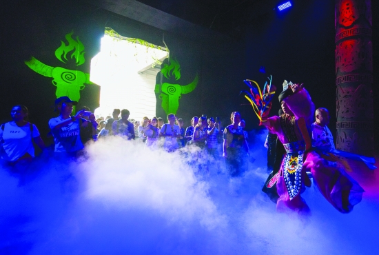 开天辟地的一声巨响!“巴代雄”作法劈开城门,带领着“三千精兵”(游客)冲进战场(巫傩神歌神秘剧场)。