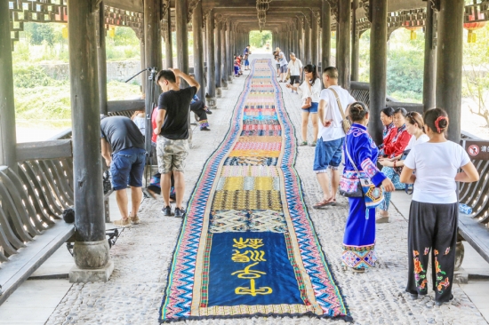 织女们在土家凉亭桥上展示《甲子顺锦》。