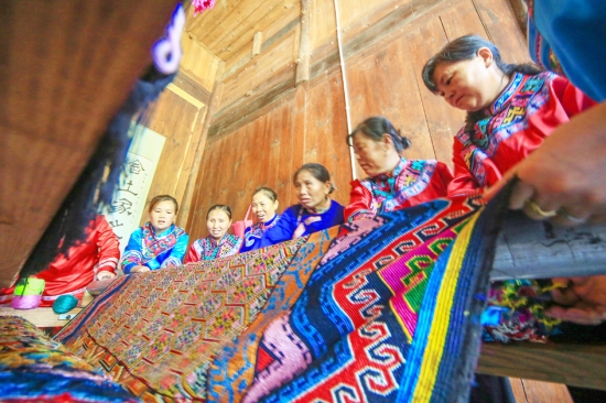 织女们在土家织锦机上展示《甲子顺锦》。