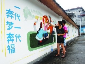8月14日,黑龙江佳木斯大学的学生在保靖县清水坪镇夕东村精心绘制文化墙,既美化了村容村貌,又净化了村风民俗。