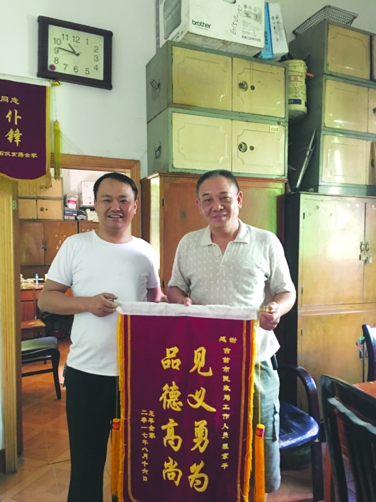 男孩的父亲王平(左)为程京平(右)送上锦旗。