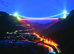 2012年3月31日,我又到了矮寨公路天险观景台,见证了湘渝高速公路矮寨特大桥通车典礼。看见一座跨度1176米世界第一、高度335米世界第二的特大桥,创新“四个”世界第一。矮寨公路天险路程原来需要40多分钟,现在一桥飞架南北,只要30多秒钟,时间一下子缩短了整整40多分钟啊,创造了中国速度。