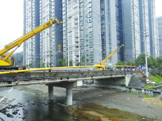 正在进行跨桥安装的燃气管道。